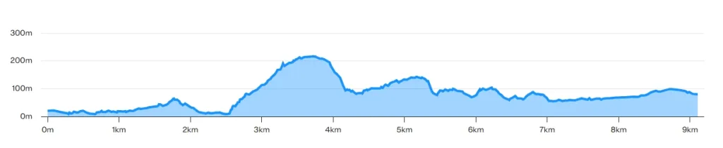 - 序盤3km地点で急な登りがあり、登りきると急な階段下り